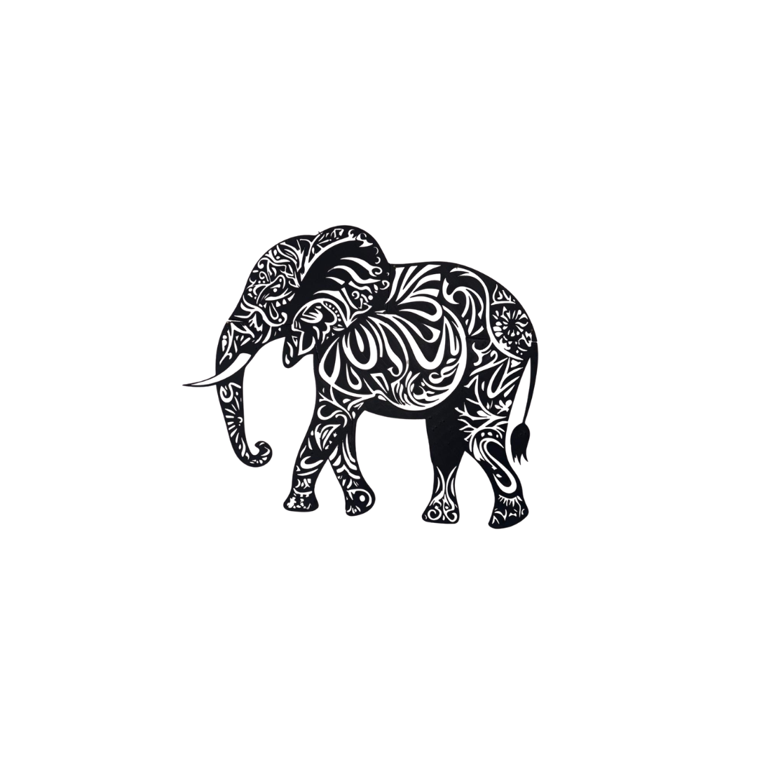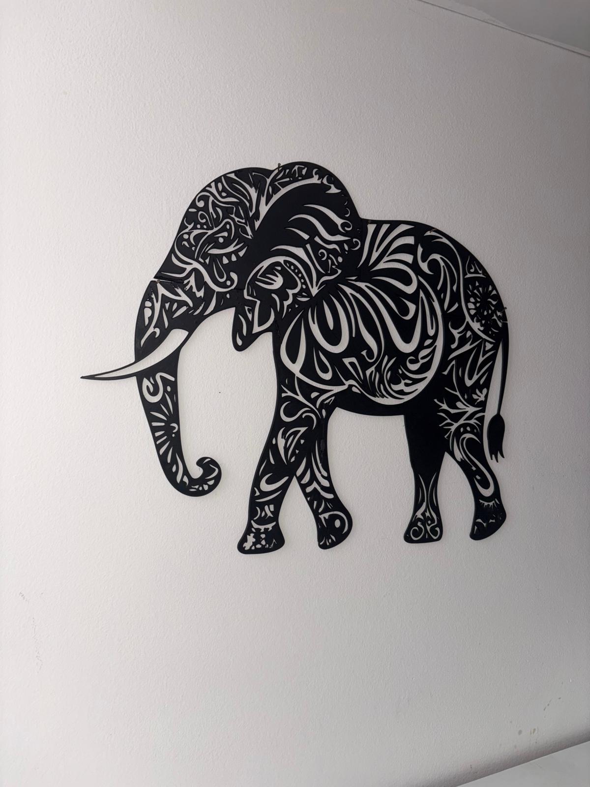 Quadro decorativo moderno raffigurante un elefante stilizzato, realizzato con stampa 3D in PLA. Design astratto in bianco e nero, elegante e decorativo, perfetto per arredare ambienti moderni o come idea regalo originale.